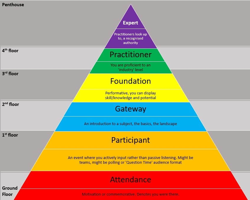 I’ve suggested elsewhere a taxonomy that employers might prefer for a Digital Badge constellation, but I think this might also map to a microcredential constellation too. I suggested these levels: