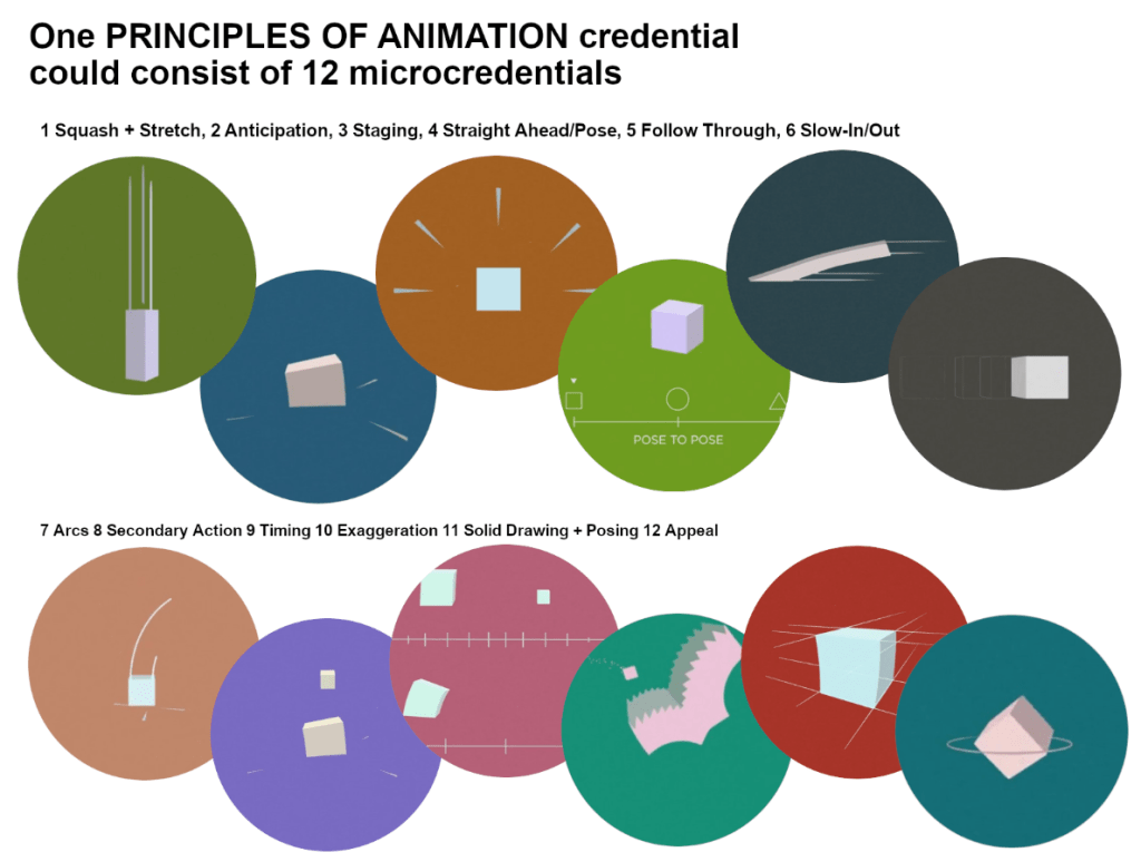 As a learner you could be encouraged to earn a ‘Principles of Animation’ credential by working through and being awarded badges and/or credits for these 12 components. As this is the industry’s own yardstick, what better way to build a constellation mini-cluster that gets aggregated into a qualification or credit?
